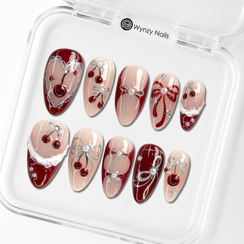Custom Red Cherry Heart Press-On Nails – 3D Gold Bow & Holiday Nail Art | Wynzy Pops Nails™